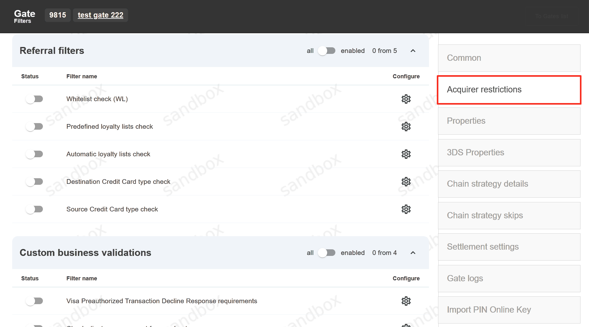 This functionality allows to set internal filters and prevent non-successful processing of transactions on gates which have specific limitations. To switch these limitations on, go to the required gate and click on the “Acquirer restrictions” tab.