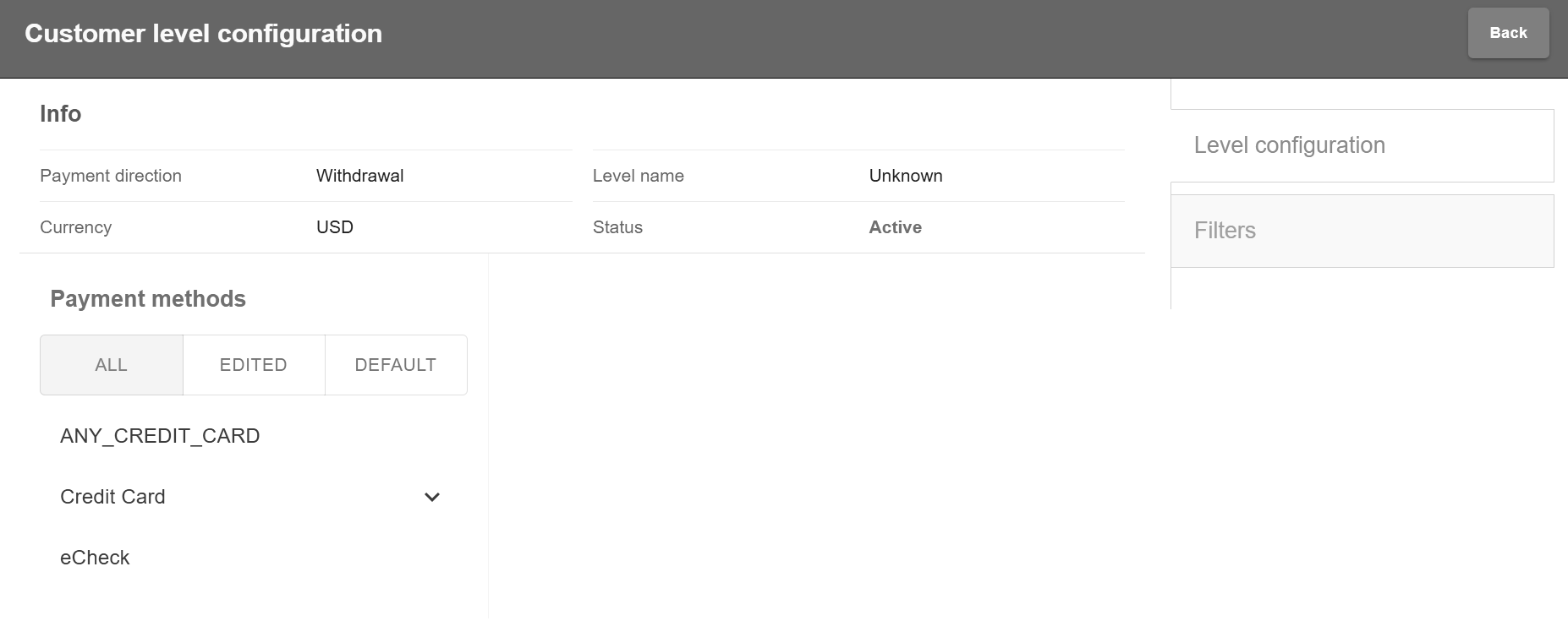Press on Level Name to access Customer level configuration. In opened window select Level configuration to setup custom payment flow for Customer level or Filters to add additional checks for level.