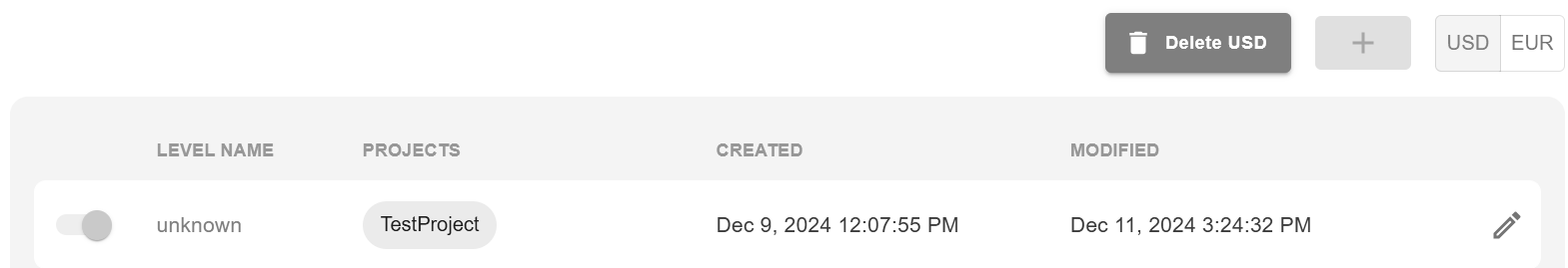 Press edit button to change level name or add/remove projects from level or Delete “currency” in order to delete the whole configuration for the currency.